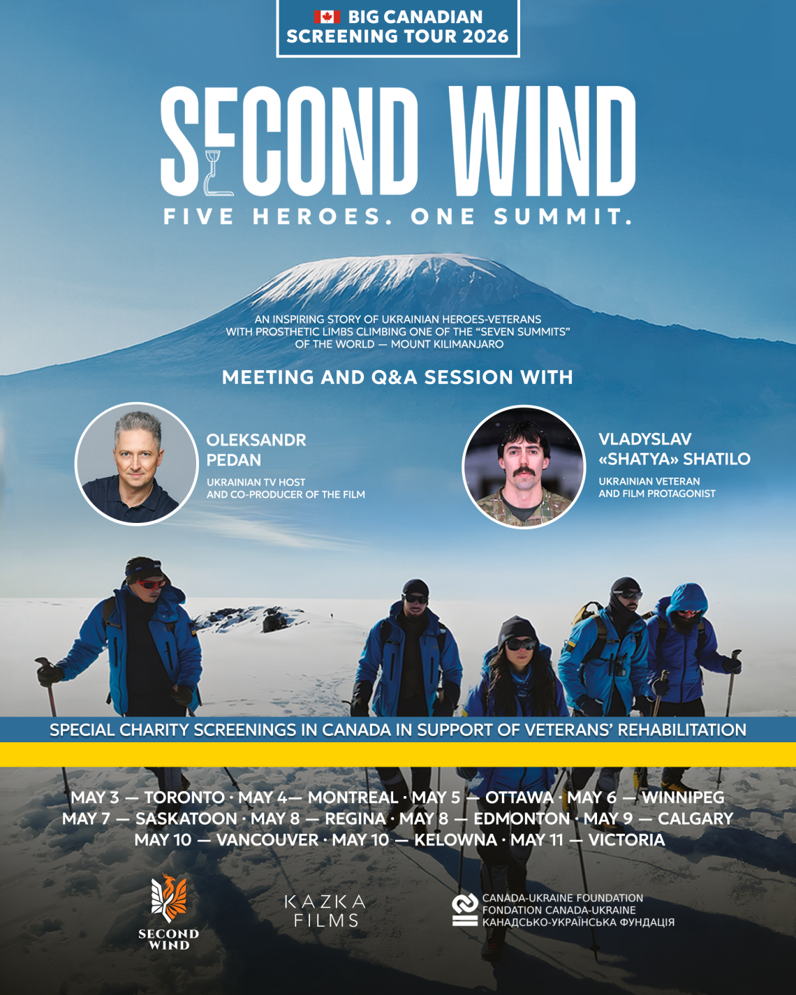 “Second Wind” is the story of five Ukrainian heroes: four veterans with lower-limb amputations and one active-duty servicewoman who climbed Africa’s highest peak — Mount Kilimanjaro. Screening Details: Sunday, May 3rd The Royal Cinemas, 608 College St, Toronto Doors Open: 6:00 PM Screening Start: 7:00 PM The screening will be in Ukrainian with English subtitles. This is a deep human story about recovery, inner transformation, dignity, and the strength to move forward despite trauma. The film follows the protagonists’ journey from pain and doubt to self-acceptance, new life direction, and a renewed sense of self-worth. The project was created by the charitable movement “Second Wind” in partnership with the foundation…